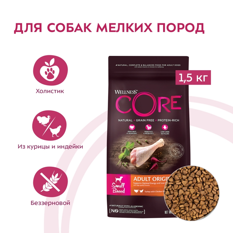 Wellness CORE — полнорационный беззерновой корм класса холистик для взрослых собак мелких пород, из индейки с курицей 1,5 кг.