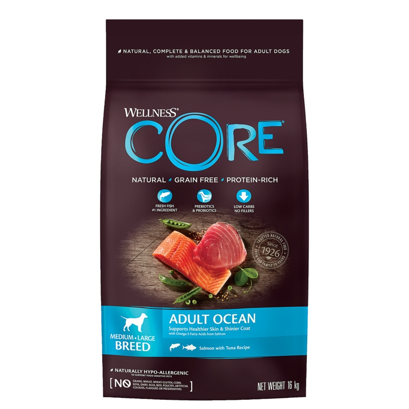 CORE - полнорационный корм класса холистик, который создан с учётом естественных потребностей домашних любимцев, которые являются хищниками по своей природе. Именно поэтому все корма Wellness CORE беззерновые и содержат свежее мясо и рыбу на первом месте во всех рационах. Каждый рацион Wellness CORE для собак обладает привлекательным вкусом, хорошо усваивается, не содержит пшеницы, клейковины, кукурузы, сои, молочных продуктов, искусственных красителей, ароматизаторов и консервантов. Рацион Wellness CORE Ocean богат рыбным белком, который помогает питомцу поддерживать хорошую физическую форму, а входящие в состав жиры и жирные кислоты способствуют улучшению шерстного покрова. В рыбе содержатся белки, жиры, минеральные соли, фосфор, йод и кальций. Входящие в состав корма морские водоросли содержат большое количество йода и минеральных веществ, способствующих ускорению обмена веществ и повышению иммунитета животного. Пробиотики и пребиотики нормализуют работу микрофлоры желудочно-кишечного тракта, улучшают моторную функцию кишечника, оптимизируют процесс пищеварения и укрепляют иммунитет. Энергетическая ценность: 3 520 ккал/кг