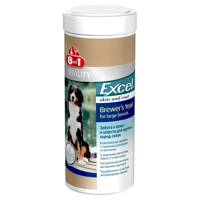 8in1 Excel Пивные дрожжи для собак крупных пород 80 таб. – это добавка, специально разработанная для поддержания кожи и шерсти собак крупных пород. Комплекс содержит пивные дрожжи, богатые витаминами группы В, чеснок, витамины (такие как, например, биотин) и микроэлементы (в т. ч. медь, цинк). В комбинации с ценным рыбьим жиром, источником жирных кислот омега-3, эта добавка способствует улучшению состояния кожи и шерсти. Кроме того, пивные дрожжи нормализуют обмен веществ, стабилизируют работу внутренних органов и активизируют иммунную систему.
