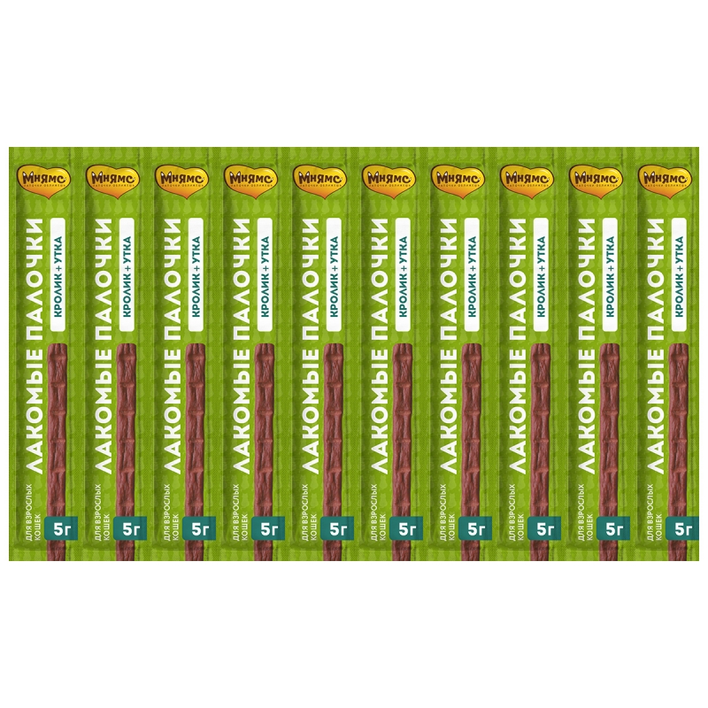 Лакомые палочки с уткой и кроликом - вкусный путь к сердцу вашей кошки. Лакомые палочки можно давать из рук, ломать и использовать для дрессировки, наполнять ими интерактивные игрушки или подмешивать в корм для улучшения вкусовой привлекательности. В составе палочек более 90% мяса. А также в составе нет злаков, глютена и ароматизаторов. Докажите свою любовь вместе с вкусными и полезными лакомыми палочками "Мнямс".