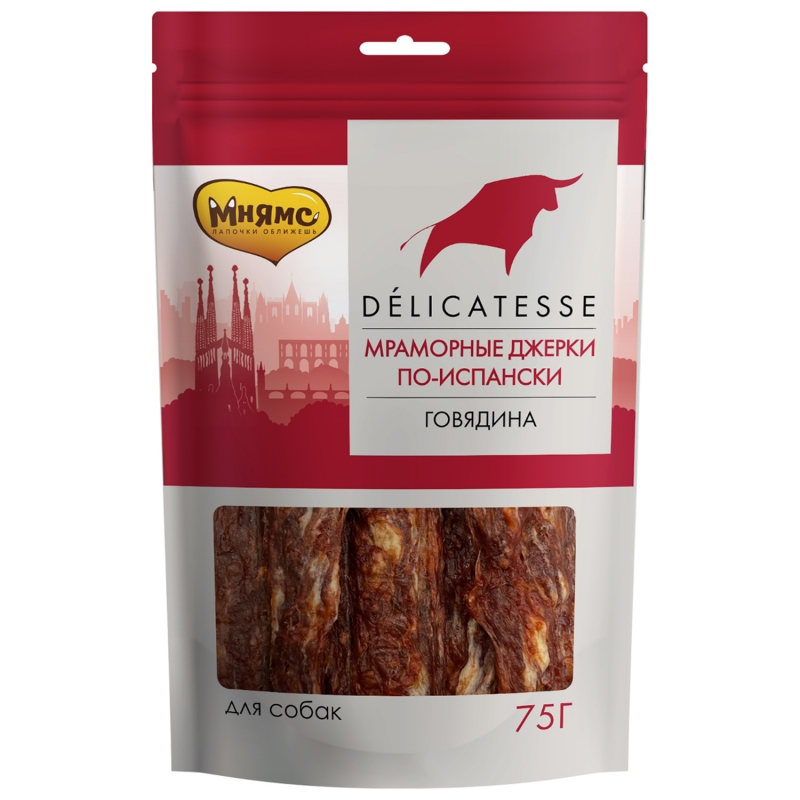 Мраморные джерки по –испански – популярное блюдо не только в Европе и Африке, но и во всем мире. Этот натуральный деликатес готовят из вяленого мраморного мяса молодых бычков. Мясо нарезают тонкими слайсами, укладывают слоями в специальную ёмкость и пересыпают смесью из перца и соли, накрывают фольгой и на сутки помещают в холодильник. Спустя сутки, выкладывают мясные слайсы на специальную решетку для сушки и вялят несколько часов. В результате получается очень вкусный и полезный мясной деликатес! - для собак и щенков старше 3-х месяцев - идеальны для средних и крупных пород - много мяса в составе: говядина 80% - без ГМО, без сои и искусственных красителей