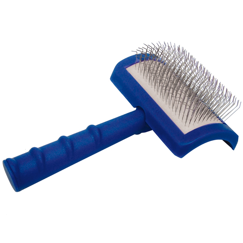 Эта легковесная щетка имеет длинную эргономичную ручку, искривленную головку и длинные мягкие булавки. Идеально подходит для ухода за щенками и деликатного вычесывания.