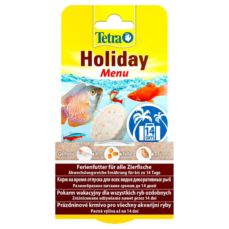 Разнообразный корм для рыб на время отпуска до 14 дней На 100 % съедобный гелевый блок корма. Содержит богатые белком пеллеты с формулой БиоАктив. Содержит все необходимые витамины, микроэлементы и минералы. Продукт обогащен невероятно вкусной дафнией и крилем. Для оптимальных параметров воды без помутнений