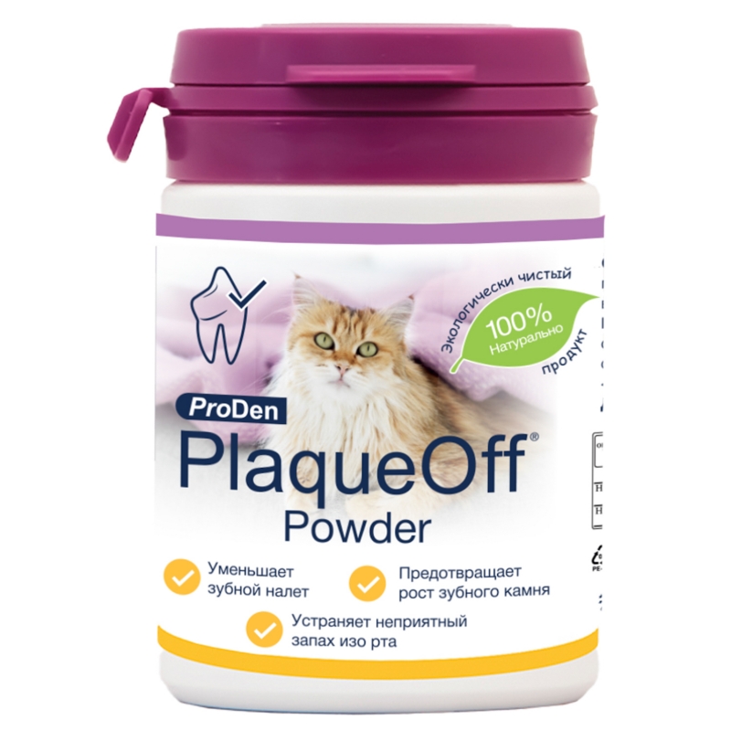 Постоянное использование ProDen PlaqueOff® Powder профилактирует образование зубного налета, камня и неприятного запаха изо рта у собак и кошек.
