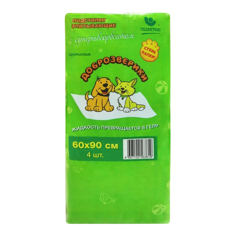 Доброзверики подстилки впитывающие для животных с суперабсорбентом 60х90 см, 4 шт. "Сухие лапки"