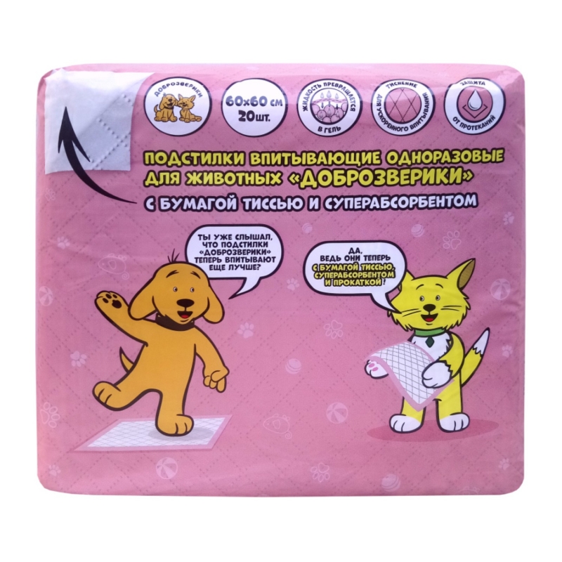 Представляем новинку от «Доброзвериков» - одноразовые подстилки для животных с бумагой тиссью и суперабсорбентом! Подстилки отлично впитывают, благодаря особому тиснению и гранулам суперабсорбента, который превращает жидкость в гель и нейтрализует неприятный запах. Бумага тиссью внутри подстилки позволяет жидкости быстро и равномерно распределиться, тем самым, поверхность подстилки остается сухой, а лапки питомца - чистыми. Подстилки легко менять - справится даже ребёнок! Они компактны и занимают минимум места при хранении. Вам наверняка понравится яркая стильная упаковка с изображением Доброзвериков.