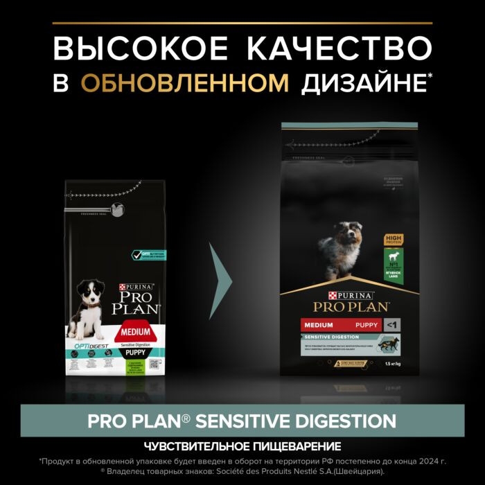 Сухой корм PRO PLAN® для щенков средних пород с чувствительным пищеварением, с высоким содержанием ягненка 1.5 кг