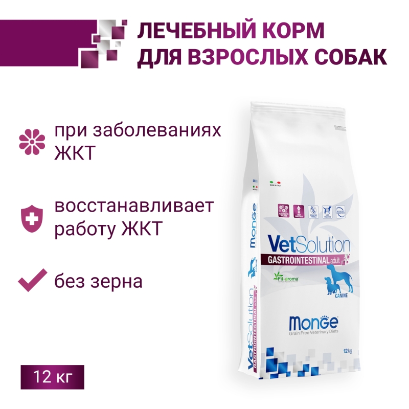 Лечебный корм Monge (Монж) VetSolution Dog Gastrointestinal для собак Гастроинтестинал при заболеваниях желудочно-кишечного тракта, таких как острый и хронический гастрит, расстройства моторики желудка энтерит и воспалительные заболевания кишечника, энтеропатии с потерей белка, синдром короткой кишки и избыточный бактериальный рост в тонком отделе кишечника, колит, а так же при остром и хроническом панкреатите (для собак, НЕ страдающих ожирением и гипертриглицеридемией) 12 кг.