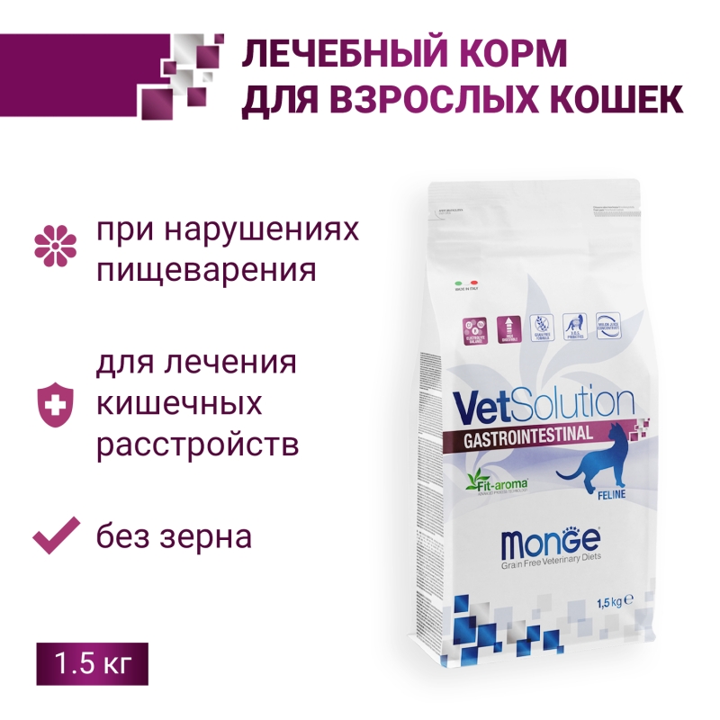 Лечебный корм Monge (Монж) VetSolution Cat Gastrointestinal Гастро интестинал для кошек при заболеваниях желудочно-кишечного тракта, таких как гастрит, колит, острый и хронический гастроэнтерит, диарея и избыточный бактериальный рост в тонком отделе кишечника 1,5 кг.