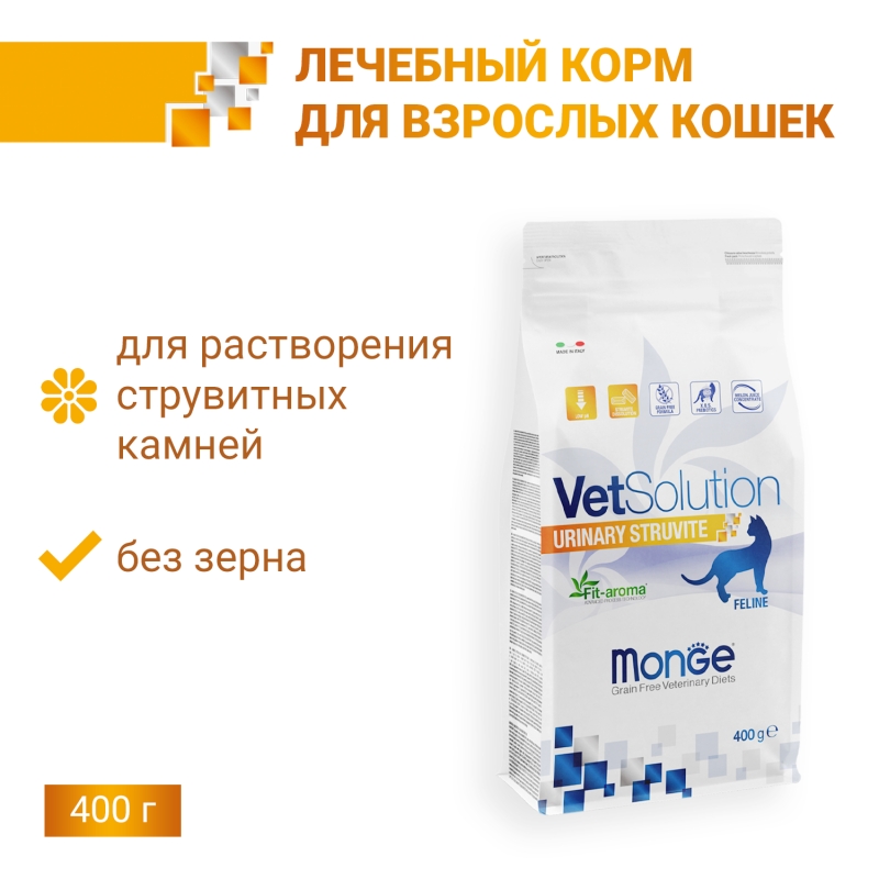 Лечебный корм Monge (Монж) VetSolution Cat Urinary Struvite Уринари Струвит для кошек при заболеваниях мочеполовой системы, таких как идиопатический цистит (синдром болезненного мочевого пузыря, интерстициальный цистит) и струвитное течение мочекаменной болезни (струвитная кристаллурия и уролитиаз) 400 г.
