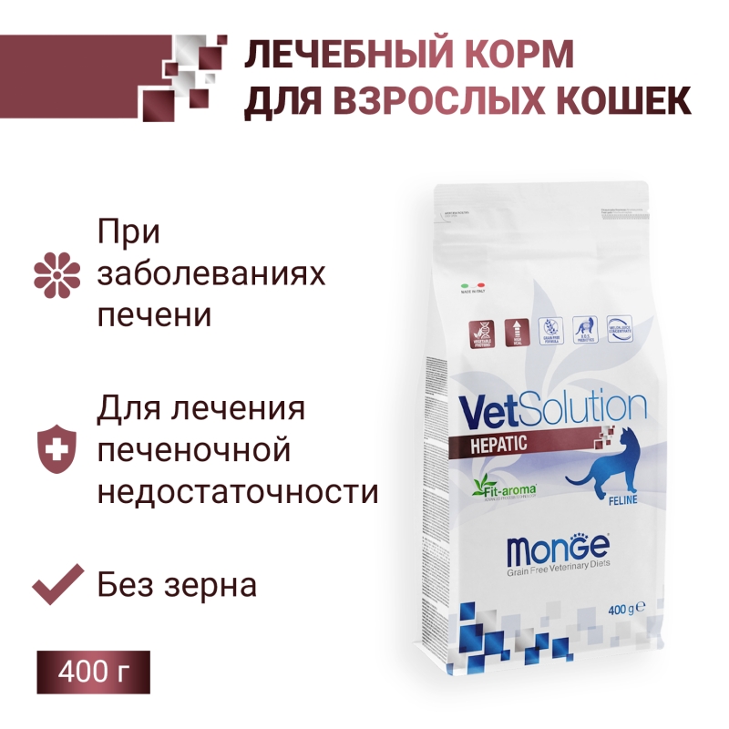 Monge VetSolution HEPATIC — полнорационный сухой диетический корм для кошек «HEPATIC» для поддержания функции печени у кошек при хронической печеночной недостаточности.