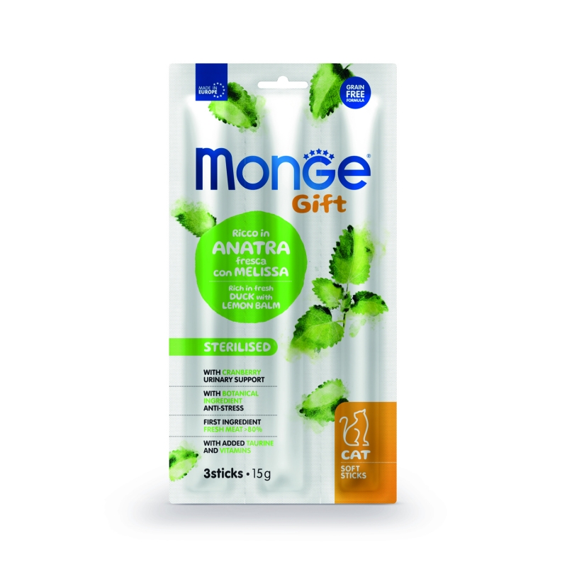 Лакомство MONGE GIFT STERILISED для стерилизованных кошек "Мягкие палочки" со свежей уткой, мелиссой лекарственной и клюквой 15 г.