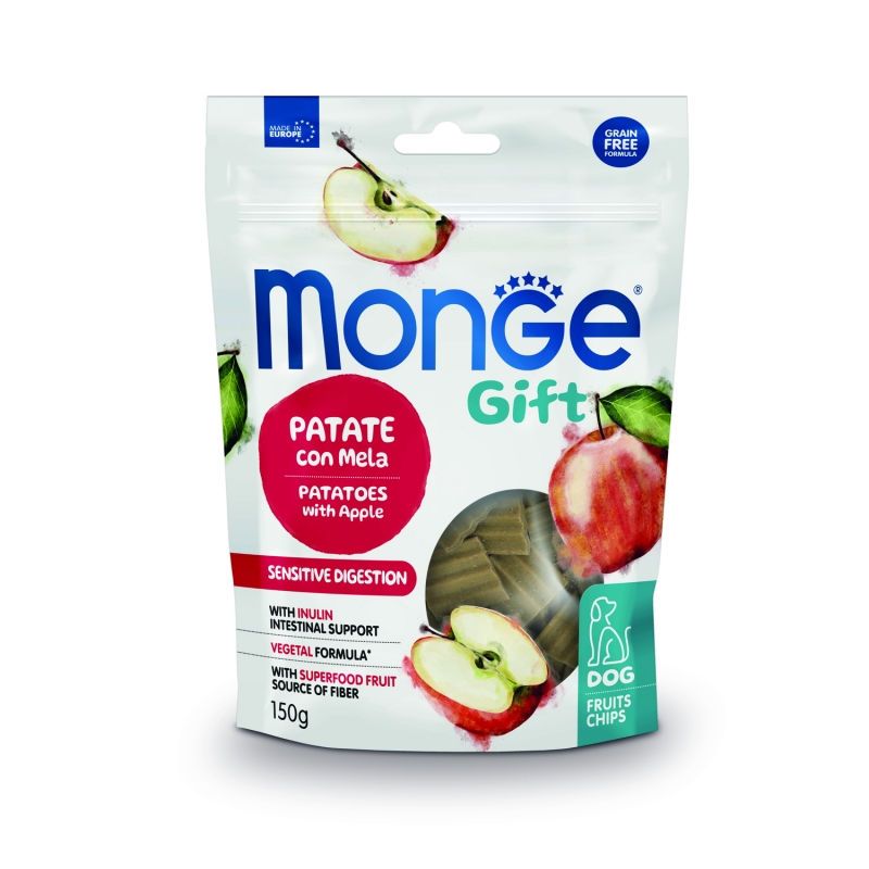 Лакомство MONGE GIFT SENSITIVE DIGESTION для собак всех пород "Фруктовые чипсы" с картофелем и яблоком 150 г.