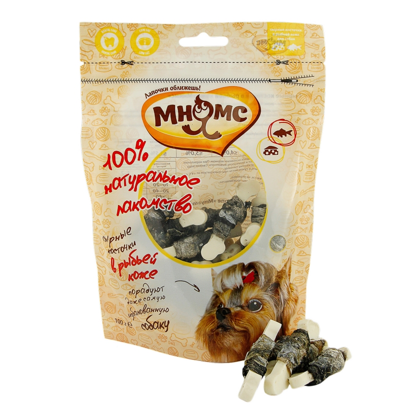 Сырные косточки "Мнямс" - это оригинальное лакомство в ароматной рыбьей коже. Благодаря своей структуре они способствуют снятию зубного камня. Вкусное и здоровое угощение идеально подходит в качестве поощрения для игр и тренировок.