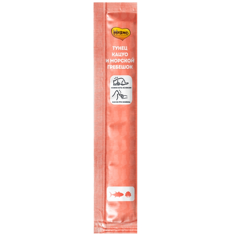 Крем-лакомство с тунцом Кацуо и морским гребешком Тёмно-красное мясо деликатесного малого тунца Крем-лакомство «Мнямс» с тунцом – это изысканное угощение с нежнейшей кремовой консистенцией. Утонченный вкус приводит кошек в восторг, а яркие эмоции довольных любимцев при кормлении с рук дарят хозяевам ощущение полного счастья. Подается как порционное угощение, или добавляется в виде аппетитного соуса к основному рациону для обогащения вкуса привычных блюд. Изготовлено по новейшей японской технологии и соответствует мировым стандартам качества.