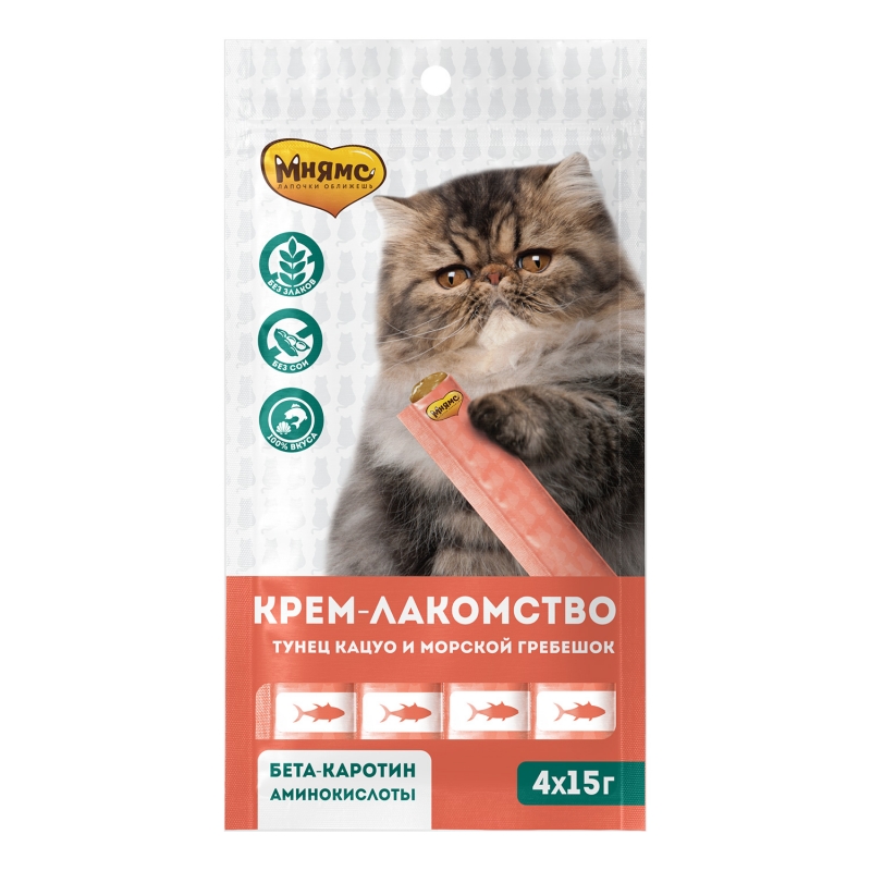 Крем-лакомство с тунцом Кацуо и морским гребешком Тёмно-красное мясо деликатесного малого тунца Крем-лакомство «Мнямс» с тунцом – это изысканное угощение с нежнейшей кремовой консистенцией. Утонченный вкус приводит кошек в восторг, а яркие эмоции довольных любимцев при кормлении с рук дарят хозяевам ощущение полного счастья. Подается как порционное угощение, или добавляется в виде аппетитного соуса к основному рациону для обогащения вкуса привычных блюд. Изготовлено по новейшей японской технологии и соответствует мировым стандартам качества.