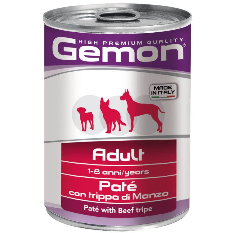 Влажный консервированный корм с говяжьим рубцом Gemon (Джемон) Dog для взрослых собак в консервах 400 г. Корм разработан специально для ежедневного питания взрослых собак всех пород в возрасте от 1 года.