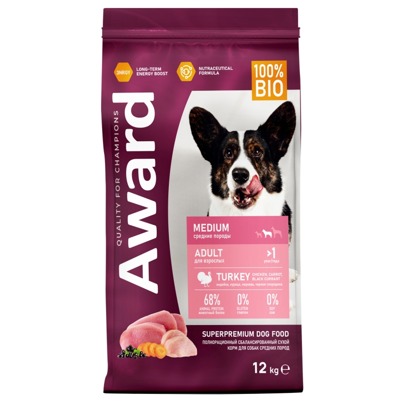 Сухой корм AWARD для взрослых собак средних пород с индейкой и курицей с добавлением моркови и черной смородины 12 кг.