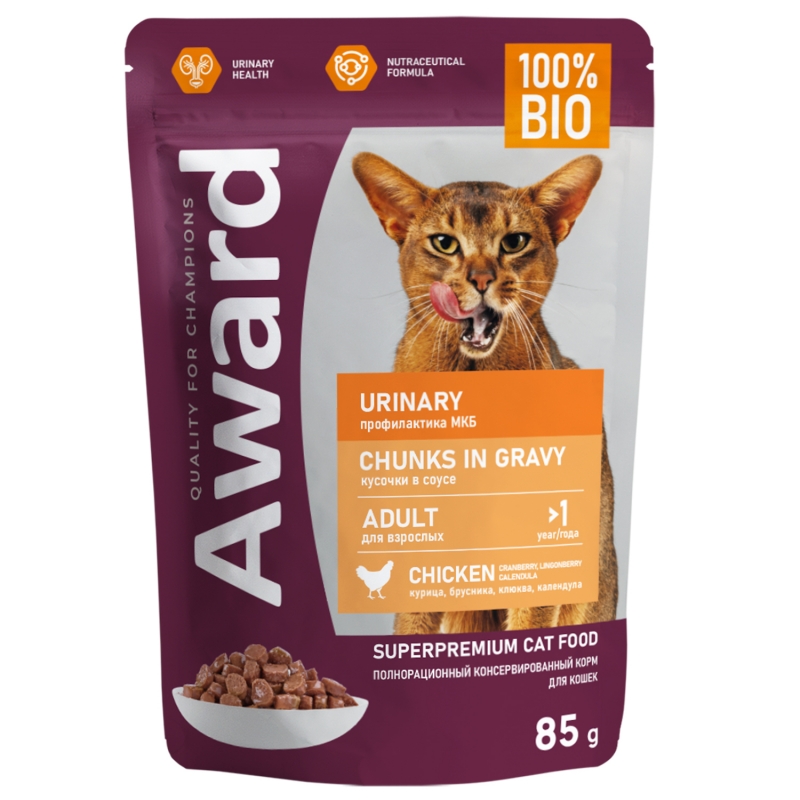 AWARD Полнорационный консервированный корм «Urinary» для профилактики мочекаменной болезни у взрослых кошек, кусочки в соусе с курицей 85 г.