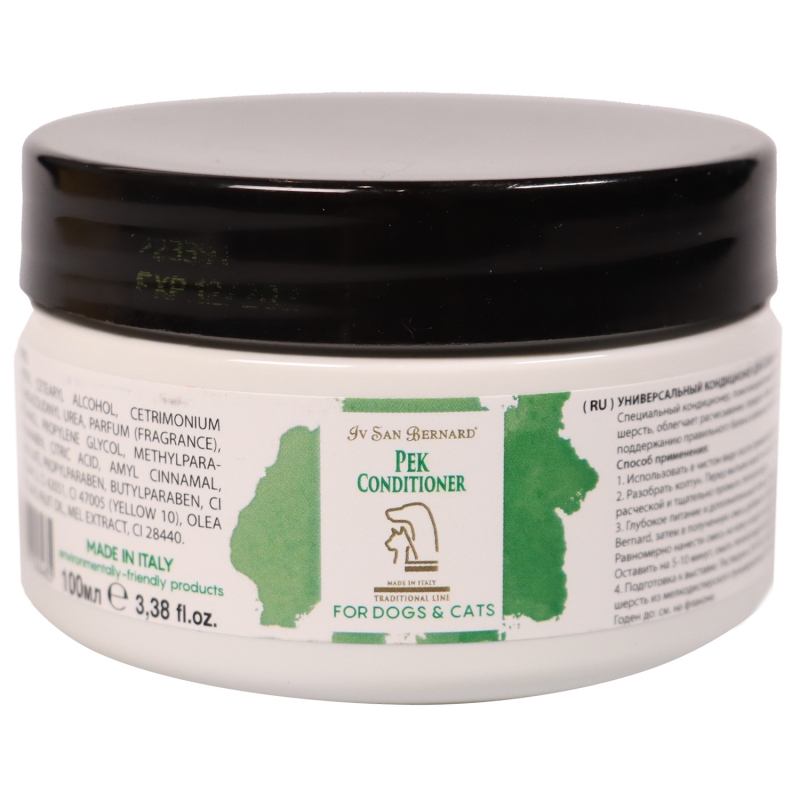Кондиционер Iv San Bernard Traditional Line Pek для распутывания колтунов Средство для борьбы с колтунами. Придает эластичность, устраняет сухость и способствует поддержанию правильного баланса влажности в коже и шерсти. Оживляет шерсть, способствует объему. Способ применения: нанести средство на 3 мин, разобрать колтун руками или расческой, при необходимости надрезать ножницами по росту шерсти, вымыть шампунем, сушить и расчесать. Подготовка к выставке: растворить 30-50 гр. средства «ПЕК» в 250 мл. теплой воды. Нанести раствор на шерсть из пульверизатора, сушить, не смывать.