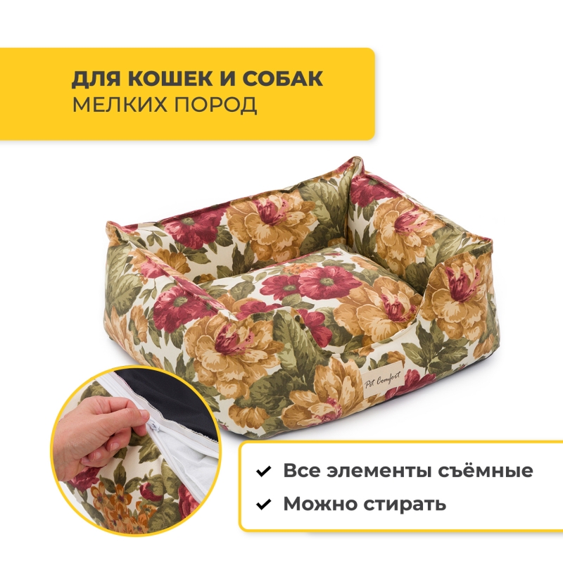Удобная лежанка с бортиками для кошек и собак мелких пород. Высокие бортики создают ощущение дополнительного комфорта. Съёмный чехол можно стирать в стиральной машине температуре 30 °C, а внутренний наполнитель на программе ручная или бережная стирка. Противоскользящая нижняя поверхность лежанки.