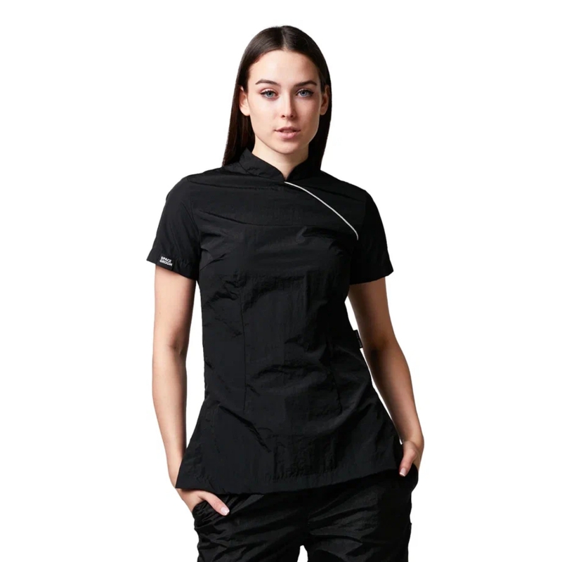 Блуза для грумеров Space Groom Pulsar 2.0, чёрная, размер L Блузка для грумера изготовлена из синтетической ткани, свободно пропускающей испарения тела, при этом ткань устойчива к истиранию, усадке и выцветанию при частой стирке, быстро сушится, легко гладится. Ткань лёгкая, не ограничивает движения во время работы, имеет антистатичный эффект. Размер: L - грудь 94-97 см, талия 71-76 см, бёдра 97-103 см, на рост 170 см. Российский размер: 46-48