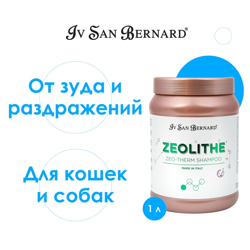 Шампунь Iv San Bernard Zeolithe для поврежденной кожи и шерсти Zeo Therm Shampoo БЕЗ лаурилсульфата натрия 1л. Формула на основе цеолита мягко и бережно очищает кожу и шерсть, борется с воспалениями, снимает зуд и шелушения, стимулирует регенерацию кожи. Обладает мощным антиоксидантным действием, борется со свободными радикалами, создает защитный барьер от УФ-излучений и от загрязнений воздуха. Применение: нанести на предварительно смоченную шерсть лёгкими массирующими движениями, оставить на 5 мин, смыть теплой водой. Для достижения оптимальных результатов после шампуня Zeo Therm Shampoo рекомендуется использовать с Zeo Therm Mask и. Подходит для проведения СПА-процедур.